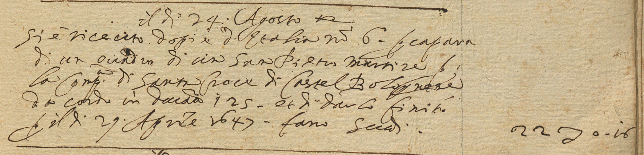Si è riceuto dopie d’Italia n.° 6, per capara di un Quadro di un San Pietro Martire per la Comp. di Santa Croce di Castel Bolognese, da cordo di ducat. 125. et di darlo finito per il dì 29. Aprile 1647. fano Scudi 22 L 0.16