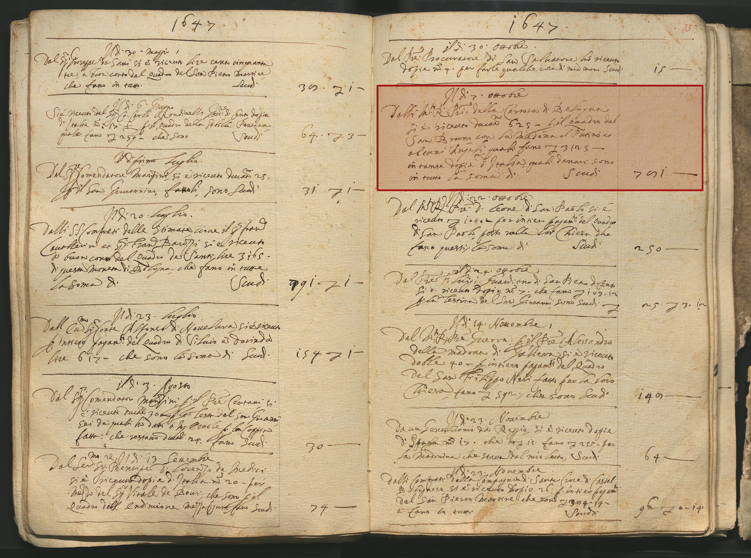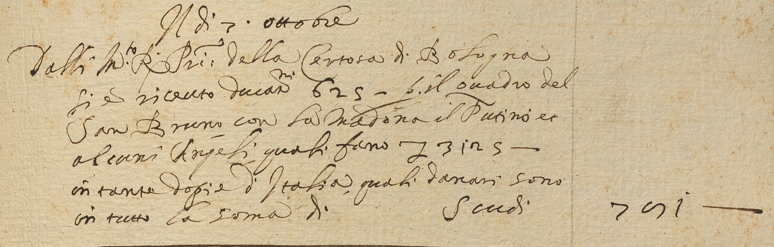 Dalli M. R.Pri della Certosa di Bologna si è ricevuto ducat. 625- per il Quadro del San Bruno, con la Madona il Putino et alcuni Angeli, quali fano L 3125- in tante dopie d’Italia, quali danari sono in tutto la soma di Scudi 781-