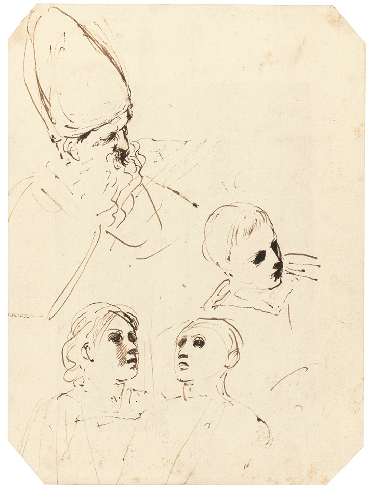 The design of the Vestizione di San Guglielmo was particularly accurate and can be reconstructed through twenty-six preparatory drawings, scattered in Italian and foreign collections, showing studies for the whole or for the main figures. The Guercino carefully investigated the position of the left arm of the saint: at first the hand was resting on the side, a position that was modified in the final drawing of the painting when the arm was raised above the head to receive the religious dress.