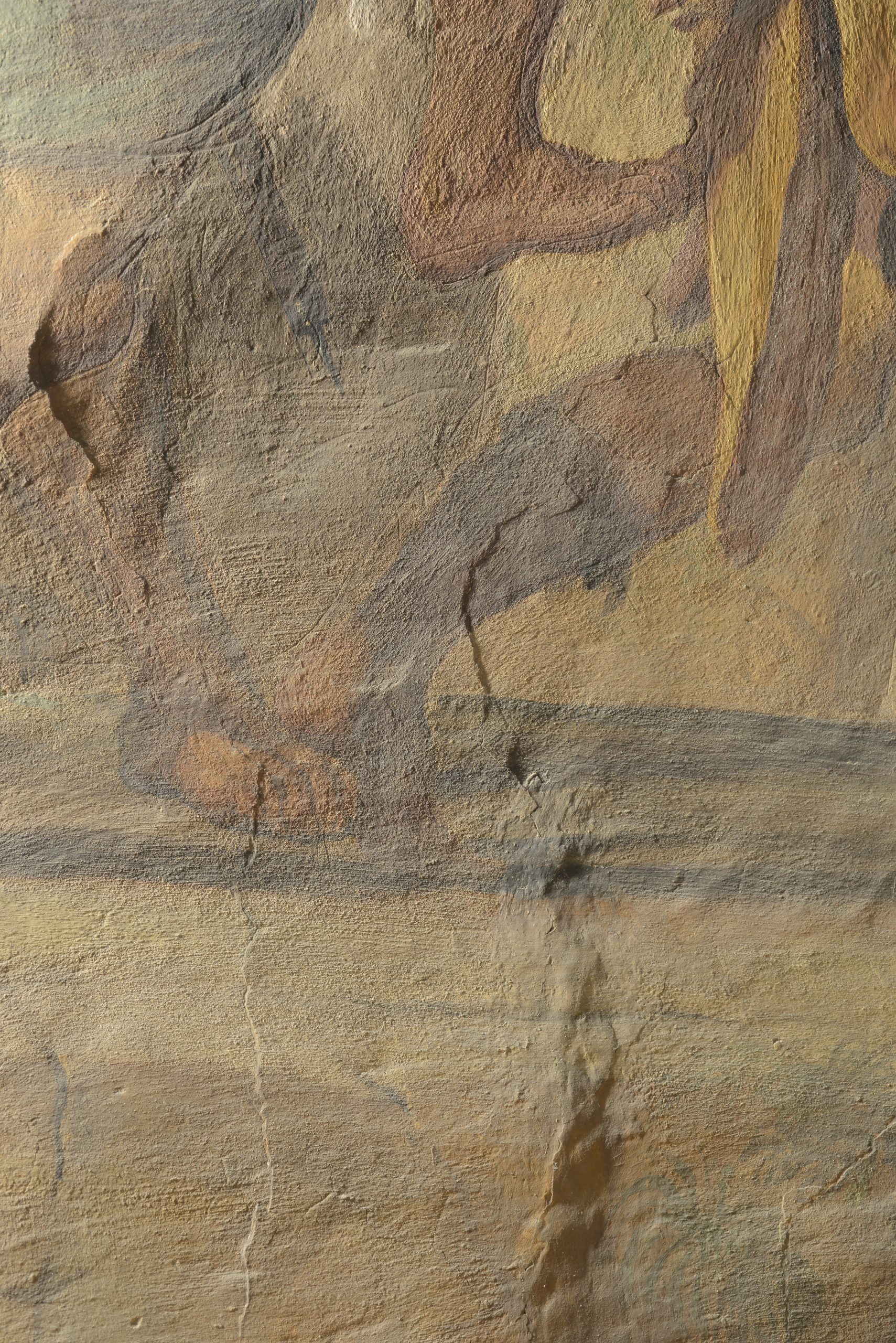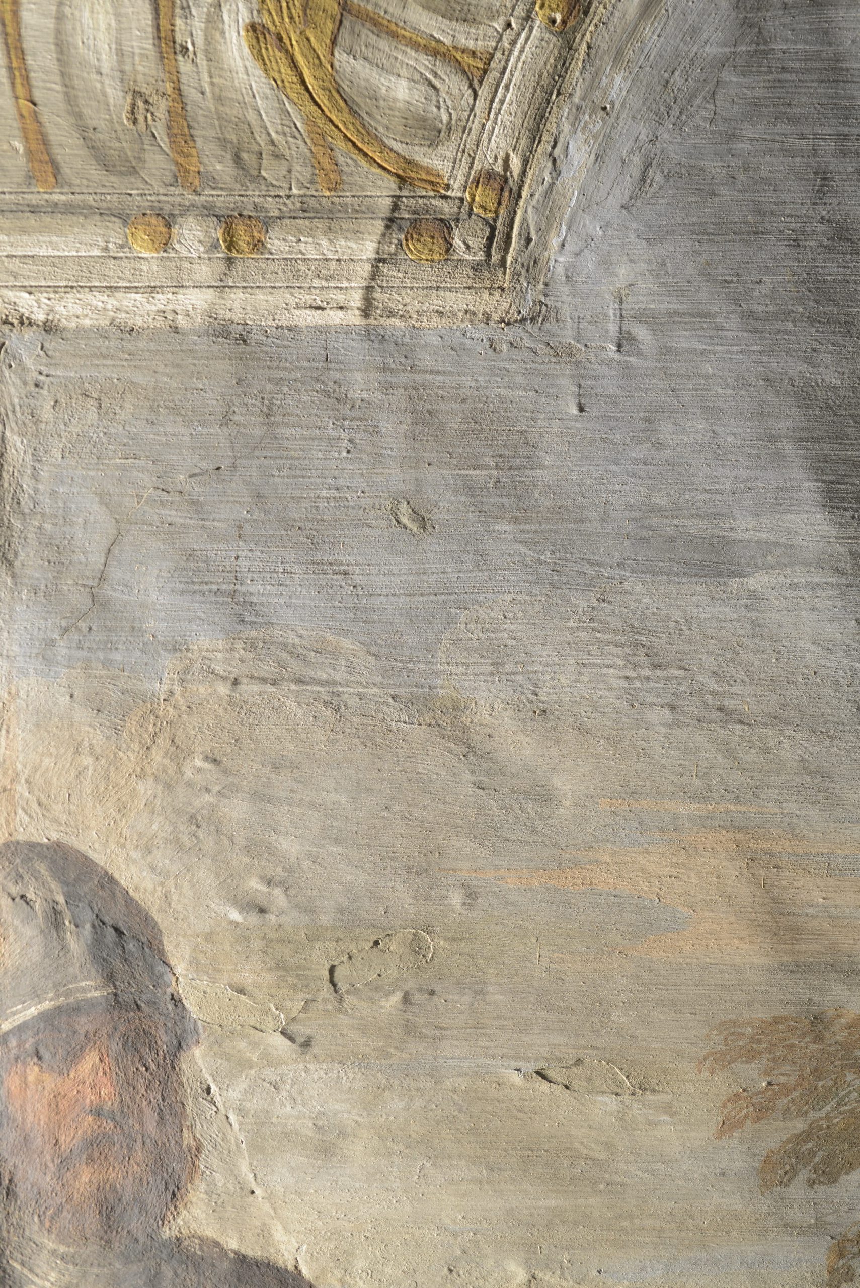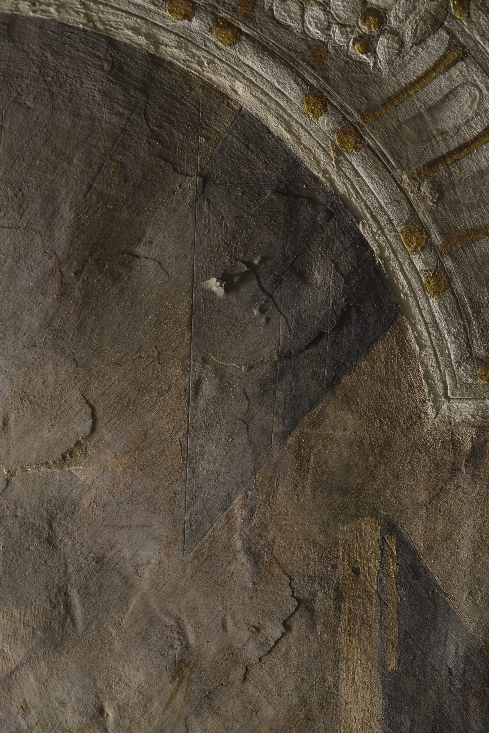 L’osservazione in luce radente ha permesso di mappare agevolmente le aree di rigonfiamento e depressione dell’intonaco, distaccato dalla muratura a causa di infiltrazioni di acque meteoriche. Sono state identificate fratturazioni e fessurazioni di entità variabile diffuse su tutta la superficie oltre che stuccature imputabili a interventi di restauro pregressi.